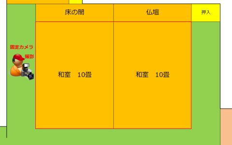 10畳2間があり、回りを廊下をで囲み、部屋に入りきれない場合はふすまを取り外して、