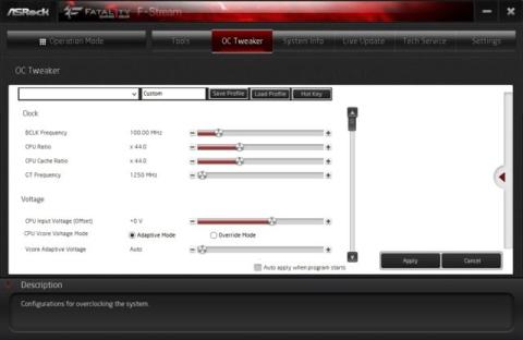 通常BIOSにてCPUのクロック等を設定できるのですが、Windows上のアプリケーションとして動作し、様々な設定を行なったり、設定を保存しておく事が出来ます。CPUのオーバークロック設定は、CPUのベースクロック(BCLK Frequency)× 倍率(CPU Ratio)で設定できます。今回のi7-4790Kの場合には、F-Stream内のOC Tweakerの画面で上記設定値を変更できます。