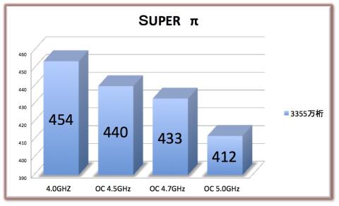 単位は秒。3355万桁の円周率がたった454秒で。さらにOC5GHzで42秒以上も短縮