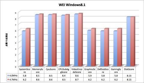 Windows8.0までは標準でコンピューターのプロパティから実行できましたが、Windows8.1ではGUIから外されています。実際にはコマンドプロンプトから実行できます。WEI(Windows Experience Index)は、コンピュータの基本的ないくつかの項目を10段階で審査するものですが、詳細な性能評価については疑問の残る仕様となっています。オーバークロック時の効果は10点評価ですと相当微細な差でしか現れませんが、WEIでは1点の差がものすごく大きいので、あえて記載します。