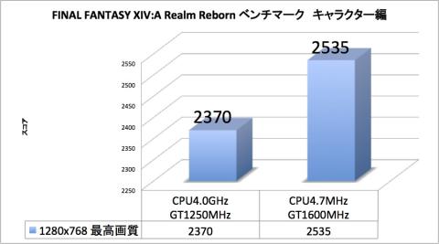 比較的新しいオンラインゲーム「FFXIV」の公式ベンチマークソフトです。標準解像度では十分な性能が出てしまうDQXのベンチマークを受けて、高解像度での試験を行いました。ただし、解像度は1280x768のウインドウ表示です。