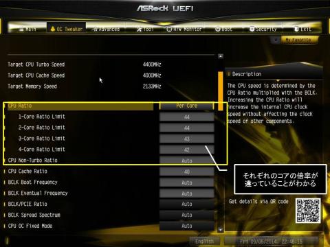 Z97 OC FORMULAの場合では「OC Tweaker」の項目内にある「CPU Ratio」を「PerCore」にすることで確認できます。
