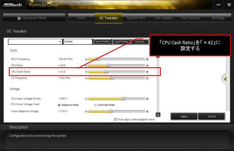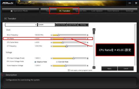 FORMULA DRIVE内の「OC Tweaker」を選択し「CPU Ratio」を45倍に設定します。