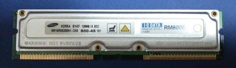 ゲーム機のニンテンドー64等に採用された超高速だったRAMBUS社のメモリ。空きスロットには終端抵抗に相当するターミネートモジュールを挿す必要がある。当時インテルがゴリ押ししていたのですが、価格が非常に高く当時128MBでローエンドPC本体が買えてしまうほどだった為、あまり普及しませんでした。初期のPentium4にはこのRDRAMが2枚バンドルされて販売されていることもありました。