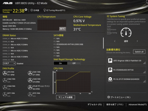 今回はCorei7-5960XとASUSのX99 DELUXEマザーを使用しました。
