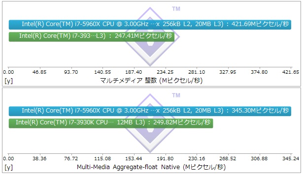 3930Kは5960Xより動作クロックでは0.2GHz速いのだが、それでも5960Xは整数・浮動小数点の双方で3割近く速いという結果を叩き出しており、IPC値も向上しているのが判る。