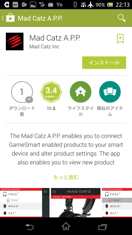 さらにGoogle Play ストアからMad Catz A.P.Pをインストールしておくとパッドのキャリブレーションが行える…はずなのですがなぜかソフト側がペアリングしたC.T.R.L.r Mobile GamePadを認識せず専用メニューが出てきません。Play Storeのレビューを見た感じほかの環境でも起きているようなので現状C.T.R.L.r Mobile GamePadは正常に認識しないようです。ゲームパッドとしての利用は問題ないのですが細かい調整ができるようになるとありがたいので早いところfixしてほしいところですね…