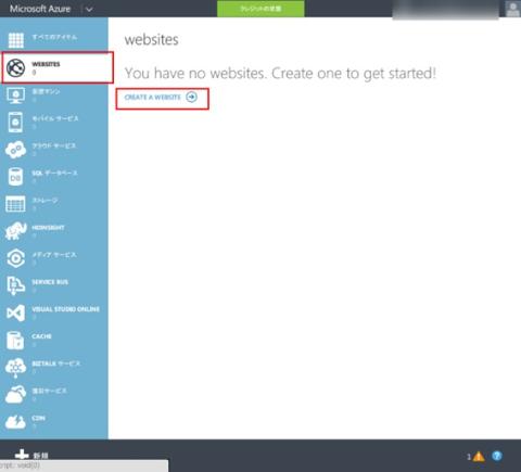Azureの管理ポータル画面の左メニューより「WEBSITES」を選択し、右の画面の「CREATE A WEBSITES」をクリックします。