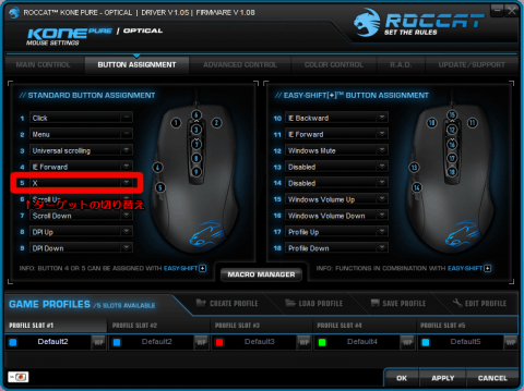 また、弾薬の切り替えも必要になるようなので、サイドボタン奥にROCCAT独自機能のEasy-Shiftを割り当て、Shift状態の左クリックに1、右クリックに2を割り当ててあります。