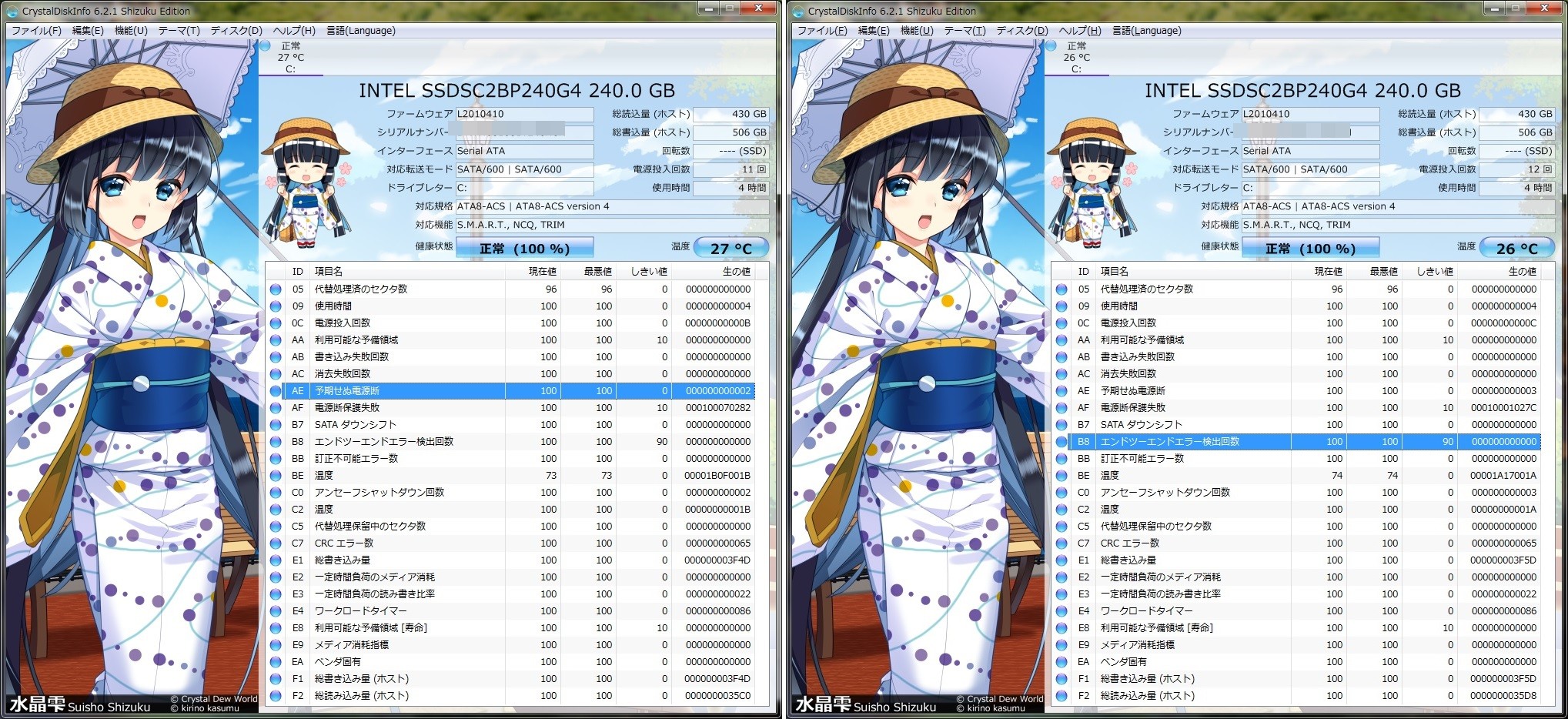 「CrystalDiskInfo」で詳細を見てみると、予期せぬ電源断のしきい値が増えていました。情報としては残るみたいですね。