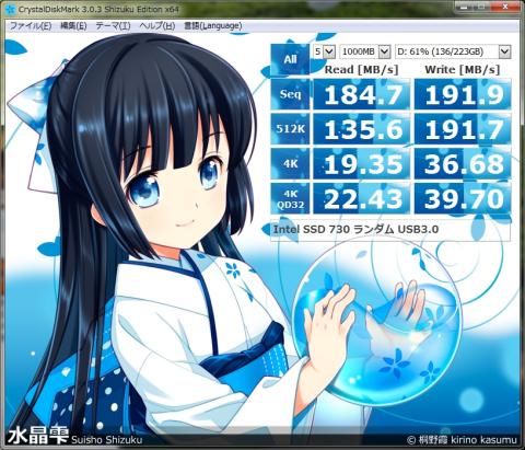 「CrystalDiskMark」というソフトウェアを使用して比較します。
