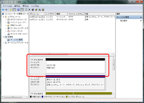 Windows7の場合、「コントロールパネル」⇒「管理ツール」⇒「コンピュータ管理」⇒「記憶域」⇒「ディスクの管理」から行います。
