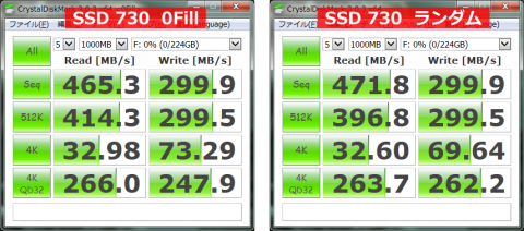 intel SSD 730シリーズは、480GBに比べて240GBはWrite性能が約半分(470MB/s⇒270MB/s)となっており、メーカー公表スペックの段階でCrucial MX100 CT256MX100SSD1より遅いという事は分かっていますので、参考比較と思って下さい。