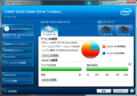 Intel® Solid-State Drive Toolboxは、SSDの健康状態や診断が出来ます。
