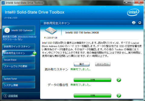 帰宅後、Intel® Solid-State Drive Toolboxの診断用完全スキャンでチェック。