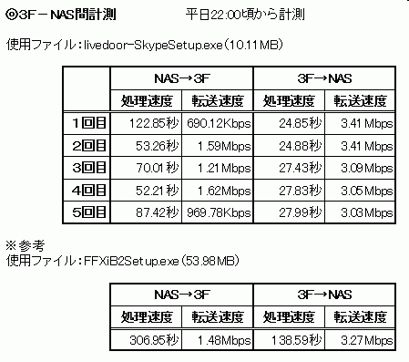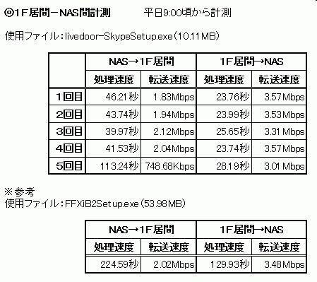 3階から1階事務所NAS、1階居間から1階事務所NAS、1階事務所内で計測した結果を、それぞれ別ファイルにして画像添付しました。