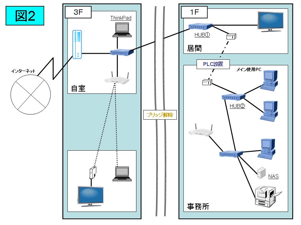 主な屋内配線は、外部に繋がっている3階自室にある無線LANアクセスポイントと1階事務所にある無線LANアクセスポイントをブリッジ接続し、家の中どこでも無線LANが使える環境を構築しておりました。