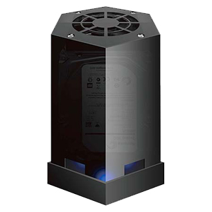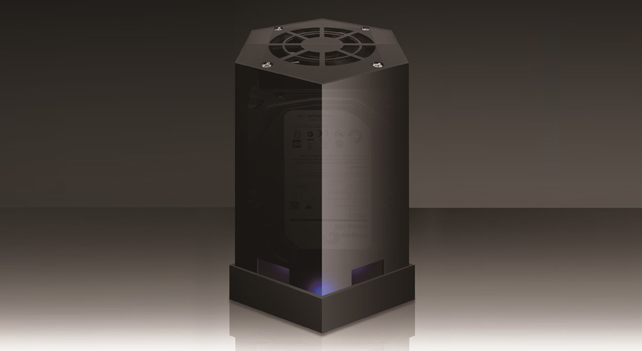 六角形のケース天井にはファンを搭載し、セットしたHDDを効率的に冷却します。
