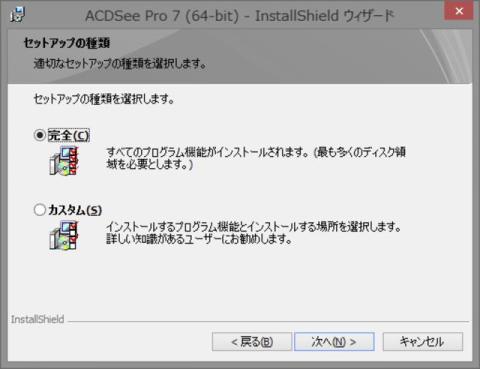 筆者の環境はWindows8.1Professional 64bit なので、64bit版のインストーラを実行します。インストール中、聞かれる項目は少ないです。標準で組み込まれる機能は比較的多めですが、実際にはRAWファイルライブラリや圧縮ライブラリ、Facebook投稿ライブラリなどなので、「完全」を選んでおけばよいでしょう。