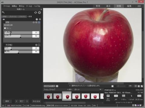 修復は写真に写り込んでしまったホコリや傷などを修正します。美肌ツール周辺をぼかしてくれます。例ではリンゴのブツブツ(果点)をホコリに見立てて修正を行っています。iPhotoのレタッチ機能とは若干操作性が異なります。iPhotoの場合は、レタッチ半径を設定して、レタッチしたい点をクリックすると周囲のテクスチャを複製して上書きします。ACDSeeの場合はコピー元を右クリックしたのち修正点をクリックします。コピー元のテクスチャを上書きしますので、指定を誤ると予想外の映像をコピーされてしまいます。この違いはしっかりと覚えておいたほうがいいでしょう。