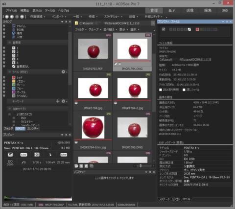 カタログ表示形式が最もACDSeeらしいファイル管理機能かもしれません。例えば、シャッター速度や露出などのタグを使って抽出をおこなったり、作業中のファイルにラベルをつけたりして必要なソースのみ抽出することができます。操作に慣れてくると、この機能が便利でしょう。