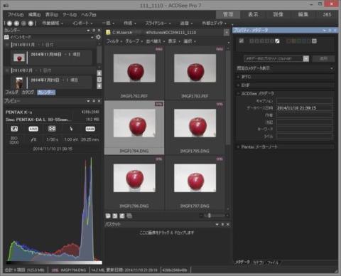 管理の単位はWindowsのフォルダ及びファイル単位です。画面中央は管理対象のファイルプレビューがあります。各プレビューの右上にファイルの種類を示すバナーが表示されています。DNGは対応フォーマットなので、DNGと表示されていますが、Pentax専用のPEFはRAWと表示されています。