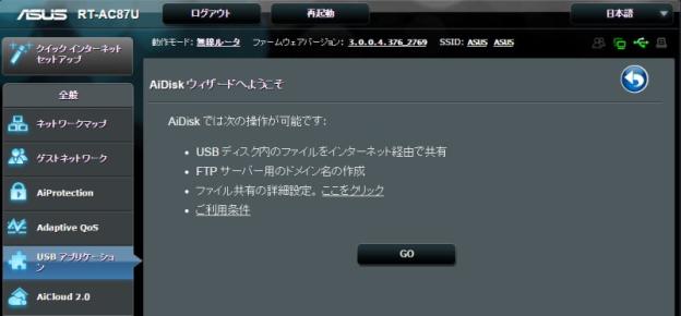 「USBアプリケーション」→「AiDisk」→「GO」をクリック。