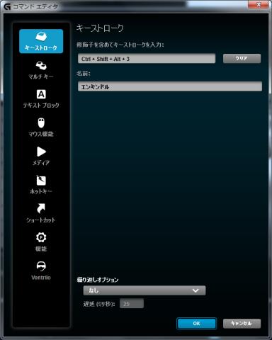 繰り返しオプションでは、そのキーストロークを一定間隔で繰り返し実行することができます。実行間隔は「遅延」のところにミリ秒(1000分の1秒)単位で指定できます。例えば1分間隔で繰り返したい場合は、1分=60秒=60000ミリ秒 なので、「60000」と入力すればOKです。