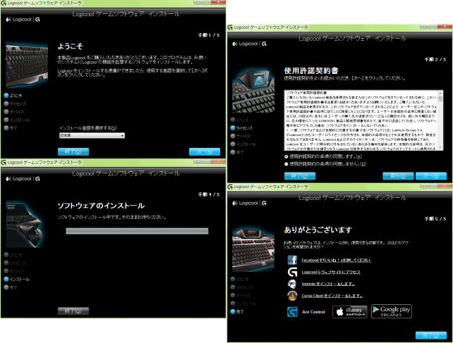 言語を選択 ⇒ 規約に同意 ⇒ デバイスの認識 ⇒ インストール ⇒ 完了