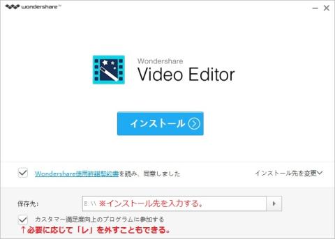 インストールを押す前に「Wondershare使用許諾契約書」を確認、その右横にある「インストール先変更>」をクリックする必要があります。