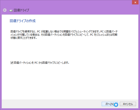 システムドライブの故障に対応できるようにPCを本格的に使い始める前にリカバリー領域を含めてバックアップする回復ドライブの作成をお勧めします。