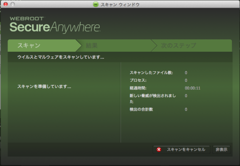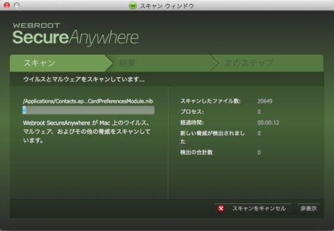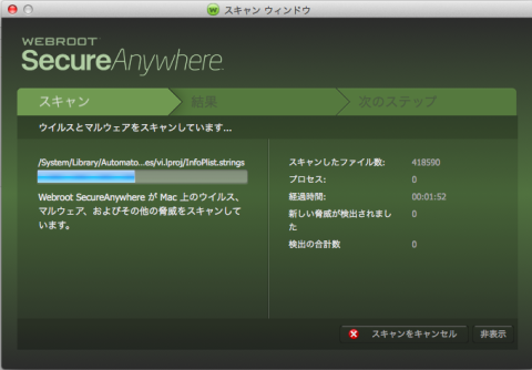 Webroot SecureAnywhereのウイルススキャン中の画面です