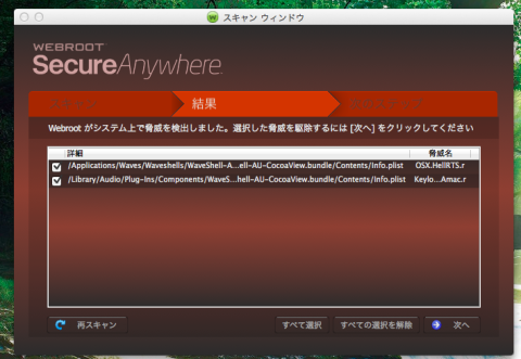 駆除検出画面が出ましたがDAWで使っているプラグインが脅威として認識されてしまったようですWaves 結構高いDAW用のプラグインエフェクターなんだけどな〜