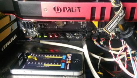 静音性も比較するため、iアプリのSoundMeterを使用。当初ケース上に置いたところ、Palit GeForce GTX960 SuperJetstream側で全く変化がなかったためやむを得ず直下にiPhoneを設置。