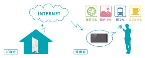 下の写真はメーカーホームページ上の説明写真ですが、インターネットを使えばどんな所でもTVが見れると言うイメージを指しています