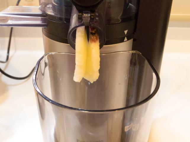 本体の電源をいれ、材料を上部の投入口から投入していくと、ゆっくりとジュースと搾りかすが排出されます。