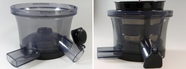 フタがついている方がジュースが出てくる出口、もう片方が搾り取られたカスが排出される出口となります。(右の写真はジュースアタッチメント装着時の写真)