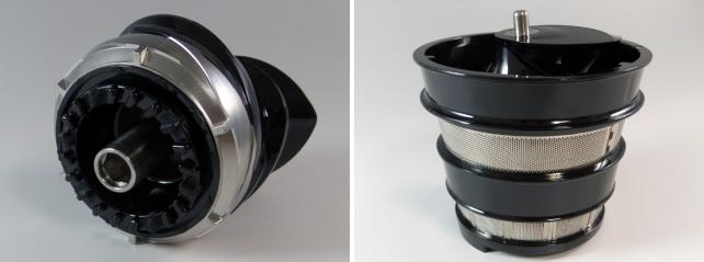 ジュースアタッチメントフィルターとスクリューの間で材料を砕き、フィルターでジュースとかすを分離、ワイパーでしっかりしぼるという構造のようです。