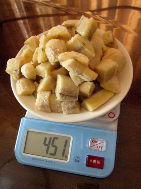 風邪を引いた時に食べきれなく、1本ずつ冷凍してあったバナナを、少し解凍して1~2cm幅に切っておき、絞っていきます。