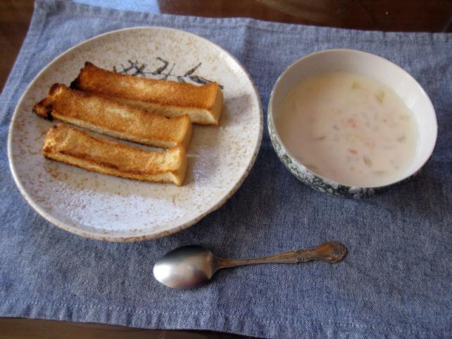 細切りにしてからトーストしたパンと共に食卓へ…