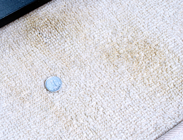 このあとは流水で洗い流すのですが絨毯ですので濡れタオルでシミの部分を拭き取りました。