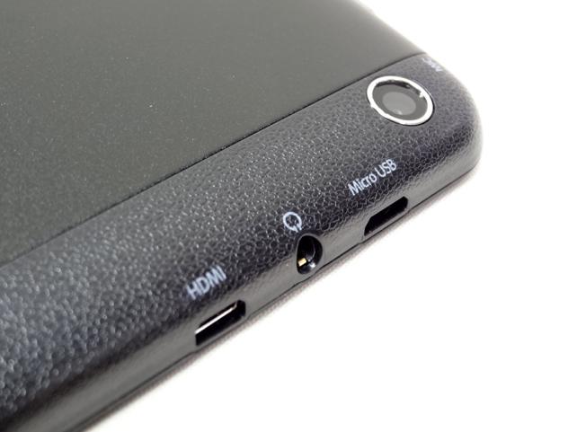 本体上部には、背面カメラ、MicroUSB端子、ヘッドホン端子、MicroHDMI端子が装備。