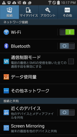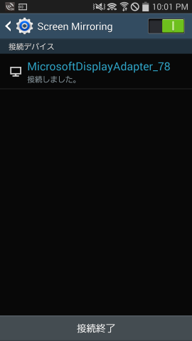 この前までメインで使っていたスマホです。Android4.4ということで、設定メニューから「Screen mirrorring」をタップし、表示されたアダプタをタップすると、、、