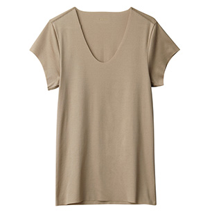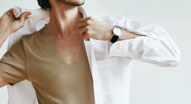 通常のアイテムより襟ぐりを深く袖丈は短めに仕上げており、ワイシャツの襟を開けて着る際には襟元から、ポロシャツの場合には袖口からシャツがのぞきにくい設計になっています。
