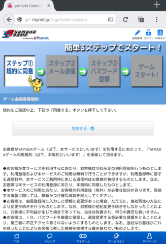 少しだけ面倒ですが、遊ぶためにはyamada gameに会員登録する必要があります。登録はとっても簡単なので少しだけお付き合いください。
