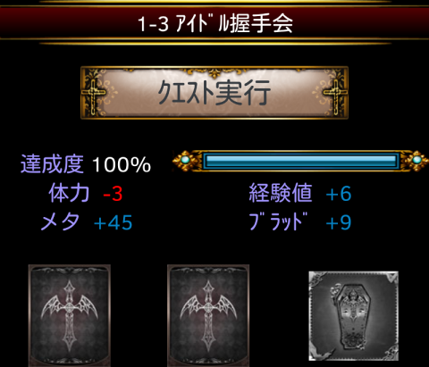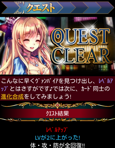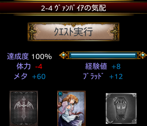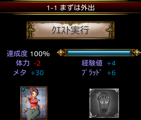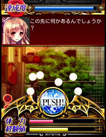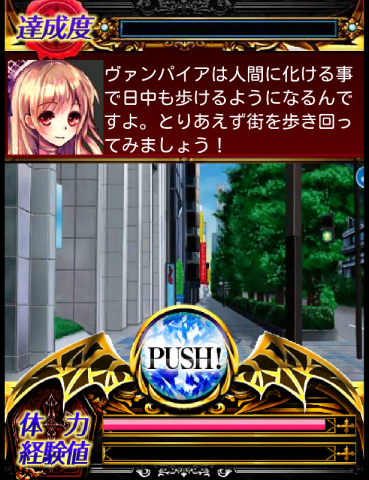 画面に見える”PUSH!”の所をタップして達成度がMAXになるとクエストクリアー。街探索の途中ではヴァンパイアを見つけること(カード入手)が出来ます。
