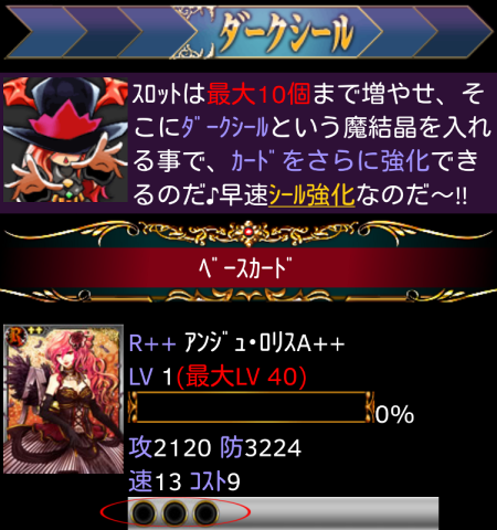 カードにはスロット(カード下の黒丸の部分)という物があって、ダークシール(魔結晶)を入れるとさらにカードが強くなるようです。これをシール強化と言うそうです。