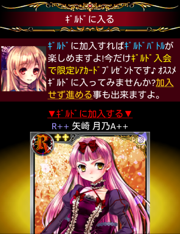 チュートリアルも終盤。最後はギルド入会です。ギルドに入会すると限定レアカードがもらえるので、当然入ります。