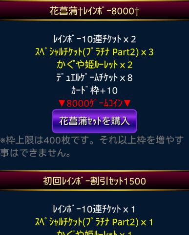 次はセットガチャ。花菖蒲†レインボー8000†とか言うのがあるんですが、なんと8000ゲームコイン!