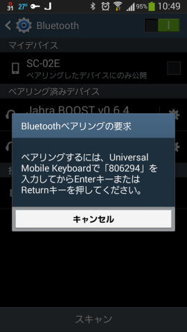 続いては、Galaxy Note2です。こちらもBluetoothをオンにし、ペアリングモードに入ると、同様に数字6ケタのパスコードを求められます。これを入力すると。。。